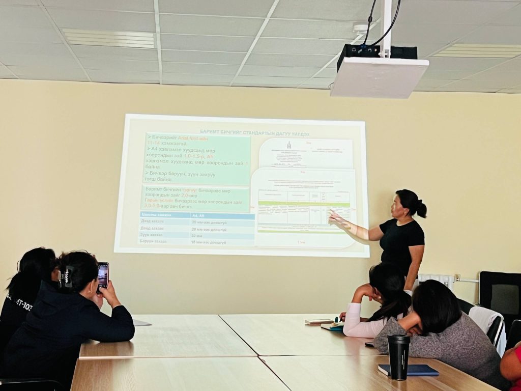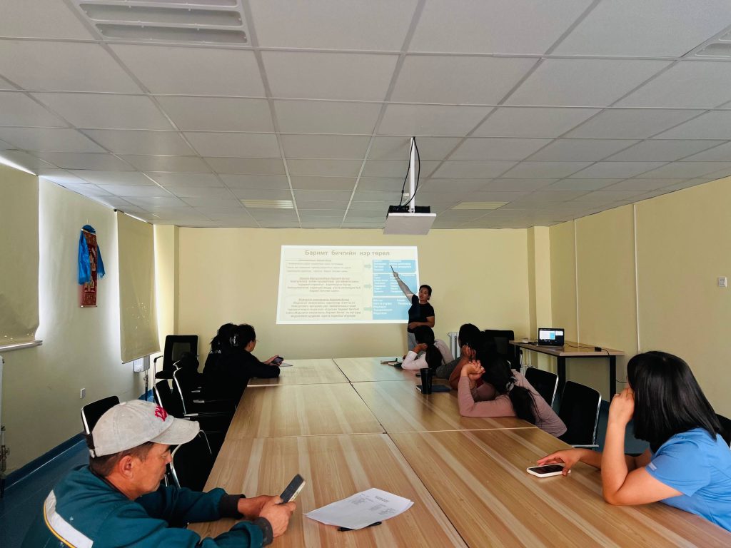 Байгууллагын дотоодын сургалтаар Хүний нөөцийн мэргэжилтэн Г.Гантуяа ажилчдад “Албан хэрэг хөтлөлтийн нийтлэг журам”, “Архивын үйл ажиллагааны нийтлэг журам” -уудыг танилцуулах, өдөр тутмын үйл ажиллагаандаа хэрхэн хэрэглэх арга зүйн зөвлөгөө өгөх сургалтыг зохион байгуулсан.