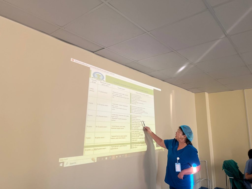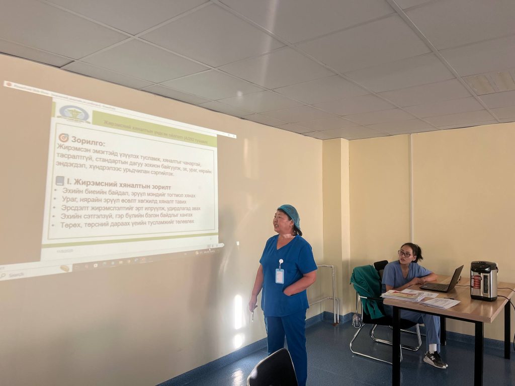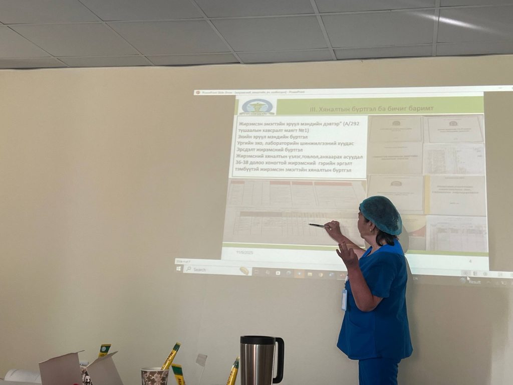 Эх барих эмч Б.Энхээ нь “Жирэмсний хяналт” сэдвээр жирэмсний хяналтыг хийхэд баримтлах тушаал шийдвэрийг танилцуулах, жирэмсэн эхчүүдийн хяналтанд хийгдэх шинжилгээ, оношлогоо, анхаарах асуудал зэрэг мэдээллийг байгууллагын дотоодын 2025 оын 11 дүгээр сарын 05-ны өдрийн сургалтаар ажилчдад хүргэсэн.